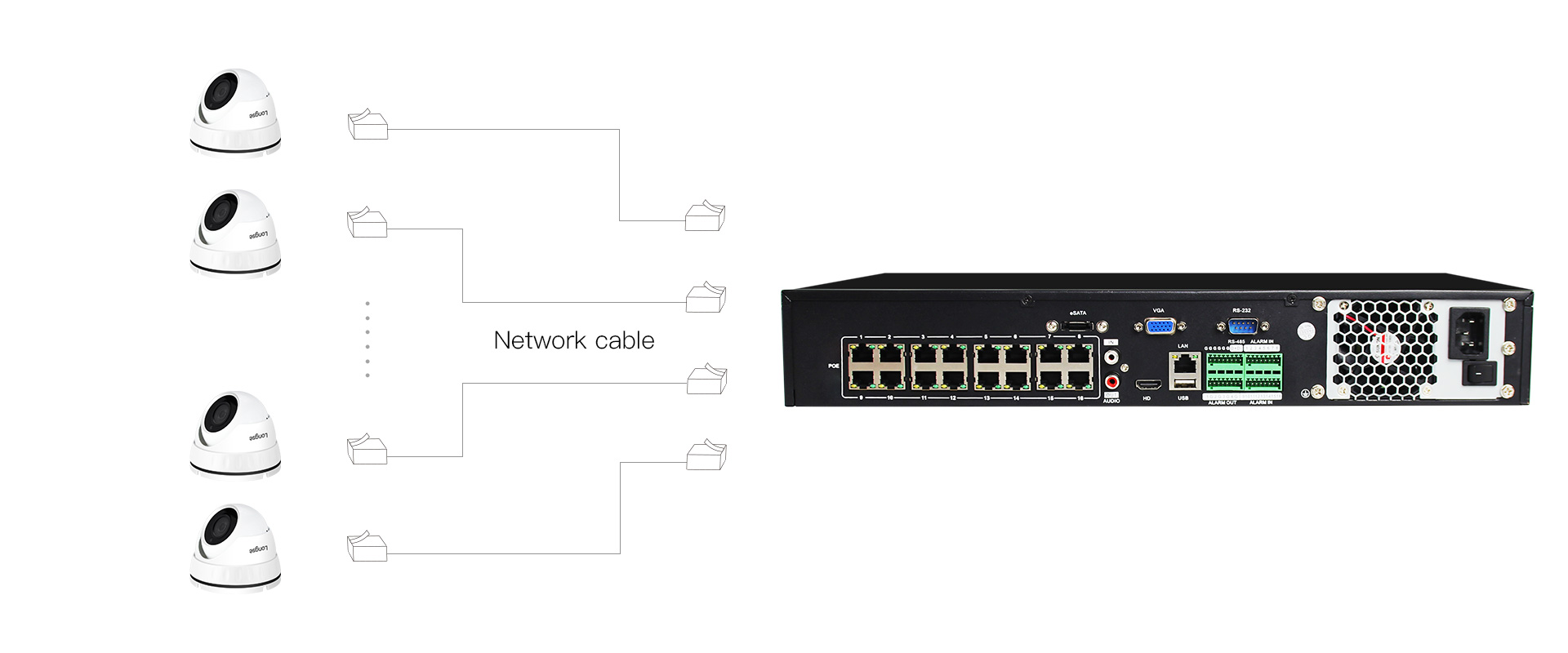 录相机撑持16个PoE通道,以一根网线的毗连便可通电16个同时撑持PoE的摄像机并能够停止